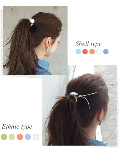 説明 リゾート感溢れる貝殻モチーフとエスニック調のヘアゴムです。